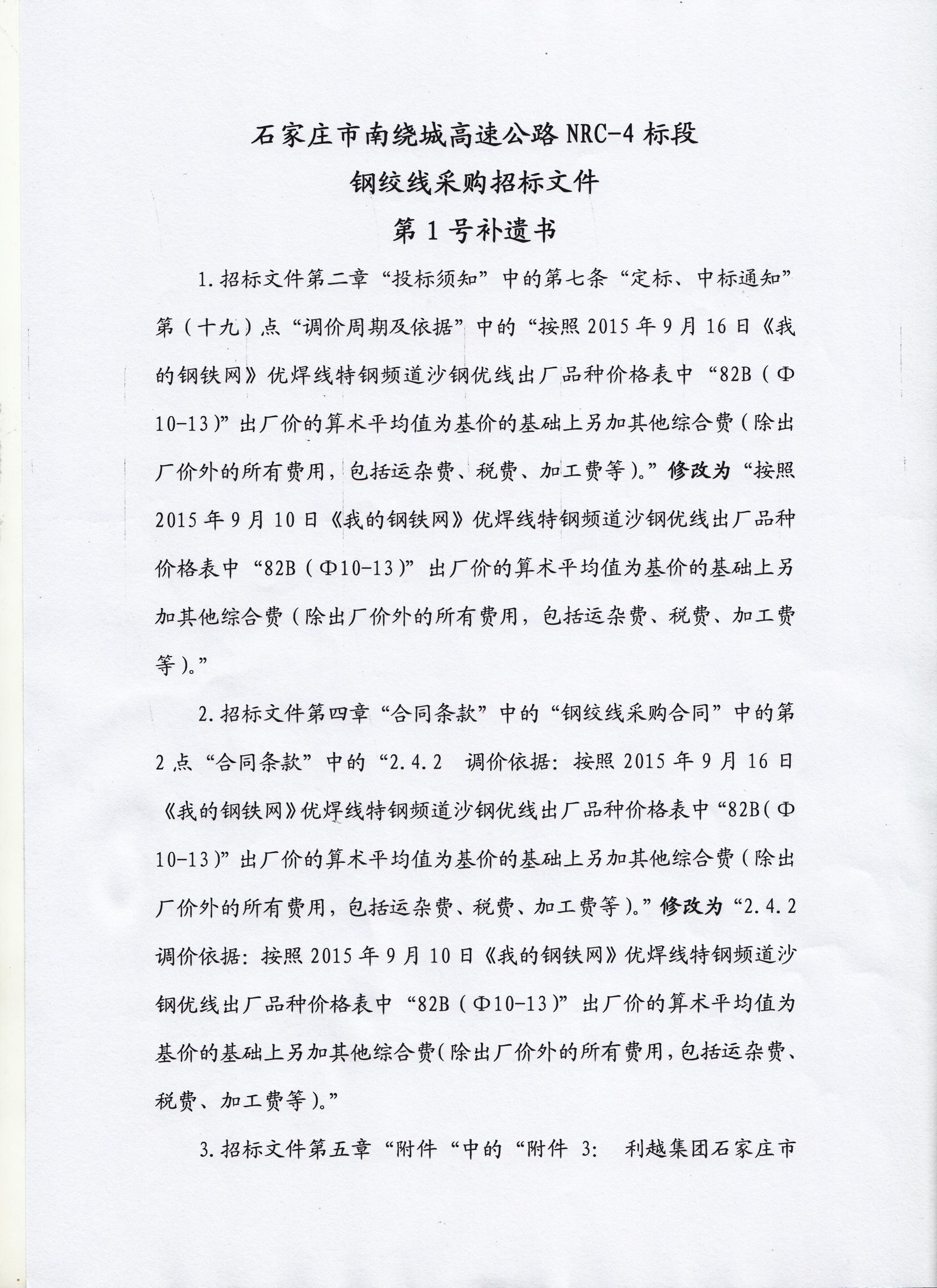 现我单位就石家庄市南绕城高速公路NRC-4标段项目钢绞线进行招标,本次招标采取公开招标的方式,并就有关事宜告知如下: