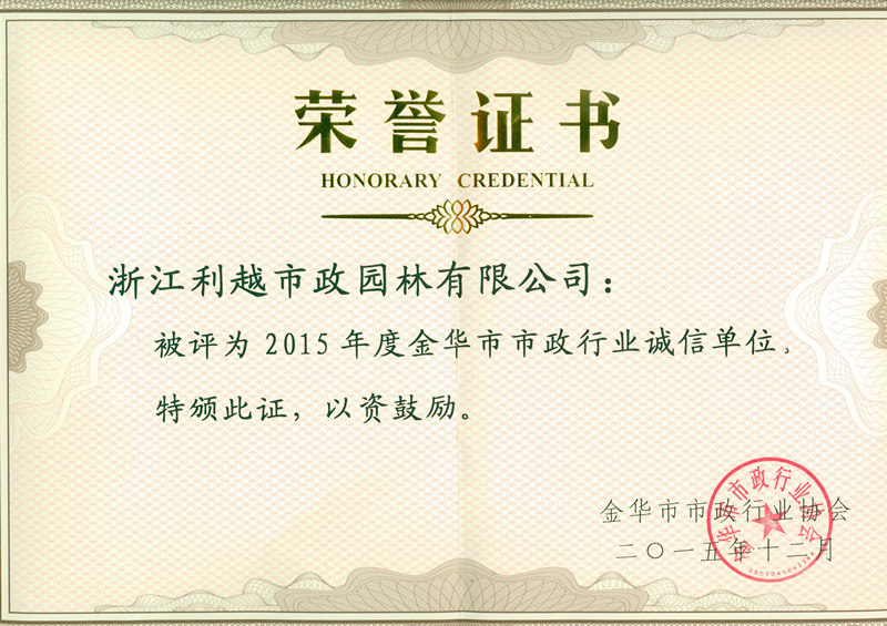 浙江利越市政园林有限公司喜获金华市诚信单位称号