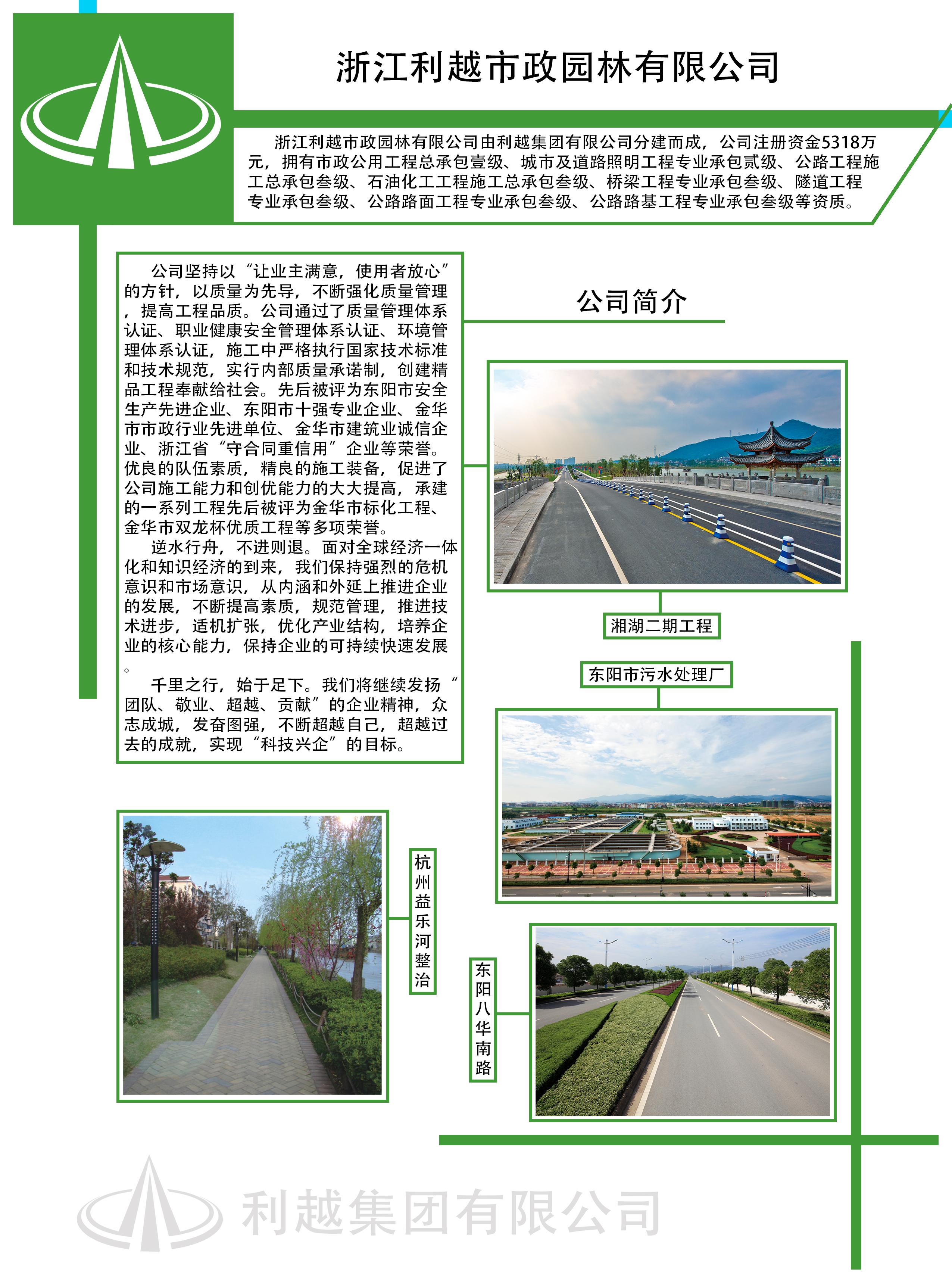 十年风雨,十年发展,十年磨练。承蒙社会各界的大力支持和厚爱,利越集团在市场经济的大潮中不断的发展壮大。特别是近年来,随着中国公路建设的加快,公司加快了前进的步伐。今天,利越集团已发展成为集市政、爆破、工民建、土石方、管道、堤防、租赁、园林、试验检测等为一体的大型综合性企业。具有国家公路工程施工总承包一级资质。企业不断扩大,综合实力日益增强、具有很强的市场拓展能力。